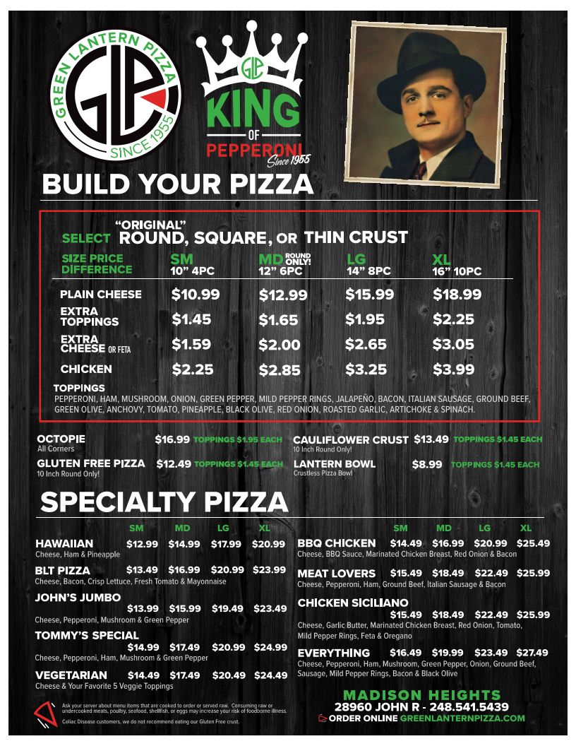 Green Lantern Pizza, located in Madison Heights, MI, is a bustling buffet restaurant renowned for its mouthwatering Detroit-style pizza. Patrons rave about the delicious crust, perfectly balanced toppings, and generous portions, including their massive Greek salad and flavorful wings. The atmosphere is lively, particularly on weekends, drawing in both locals and visitors. With an inviting staff that enhances the dining experience, it's no wonder that this spot has become a beloved destination for pizza lovers. Whether dining in or opting for takeout, Green Lantern Pizza promises an enjoyable culinary experience that keeps customers coming back for more.